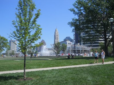 In the past few weeks, I've really changed my mind. I've strolled around the newly hip and vibrant Short North District, hung out again at Schiller park in German Village taking in a free play, and marveled at the connection Columbus somehow has with the Royal Shakespeare Company, which produced an amazing kid-friendly (!) production of Hamlet last month. However, the key to the resurrection of Columbus, in my mind, is the new parks downtown. They have really gotten serious about reshaping their public places in the city and it is really paying off. There is now a string of parks along the Scioto River, the "Scioto Mile," all interconnected by bike paths. There is now the biggest splash park I have ever seen, which will draw families back to downtown. There is a new central park in place of the old City Center Mall, Columbus Commons, which comes complete with a carousel, an outdoor library, beautiful gardens, and European-style outdoor cafe. There are pedestrian-friendly bridges linking the east and west banks of the Scioto, meaning that people can easily walk from COSI to downtown (the new Main Street Bridge is the first inclined arch bridge in North America). The central park is linked to the waterfront parks by cobblestone streets and urban gardens. Very cool. Behold a city reborn!